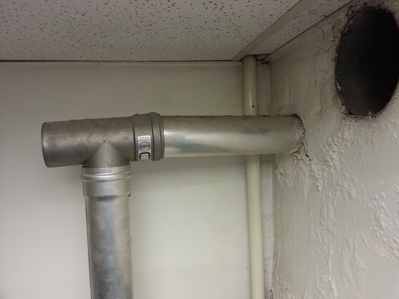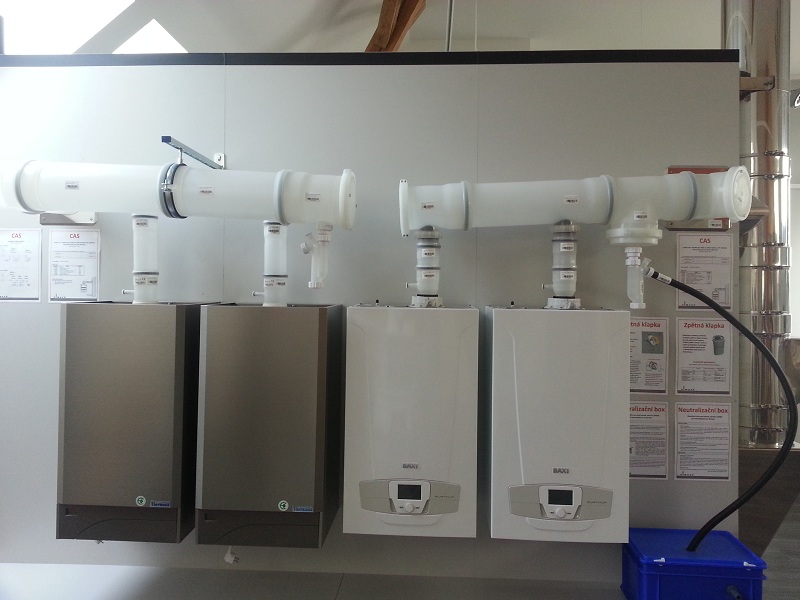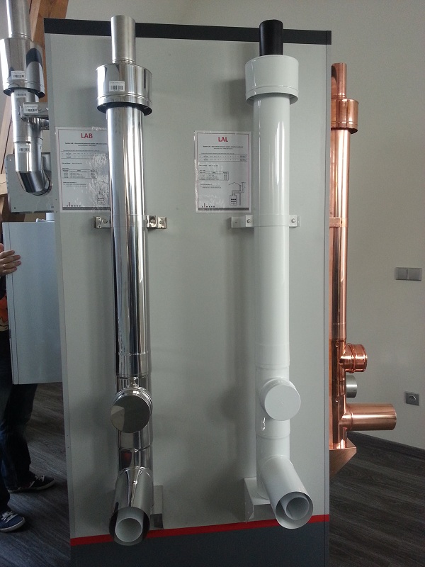 A legtöbb esetben 80/80 mm rendszer. A kazánból itt két cső jön ki, az egyik a füstgáz elvezetésére szolgál, a másik az égéshez szükséges levegő beszívására. A füstgáz elvezetésére szolgáló csövet a tető fölé kell vezetni. A levegő beszívására szolgáló csövet ki kell vezetni kültérbe.